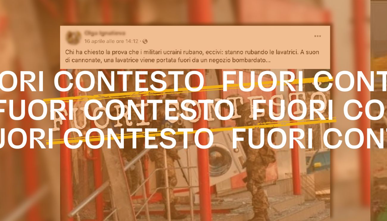 Il 16 aprile 2022 su Facebook è stata pubblicata una foto che mostra due militari trasportare una lavatrice fuori da una struttura danneggiata. L’immagine è accompagnata da un commento, scritto da chi ha pubblicato il post su Facebook, in cui si afferma che la scena mostrerebbe due soldati dell’esercito ucraino mentre rubano una lavatrice «da un negozio bombardato».