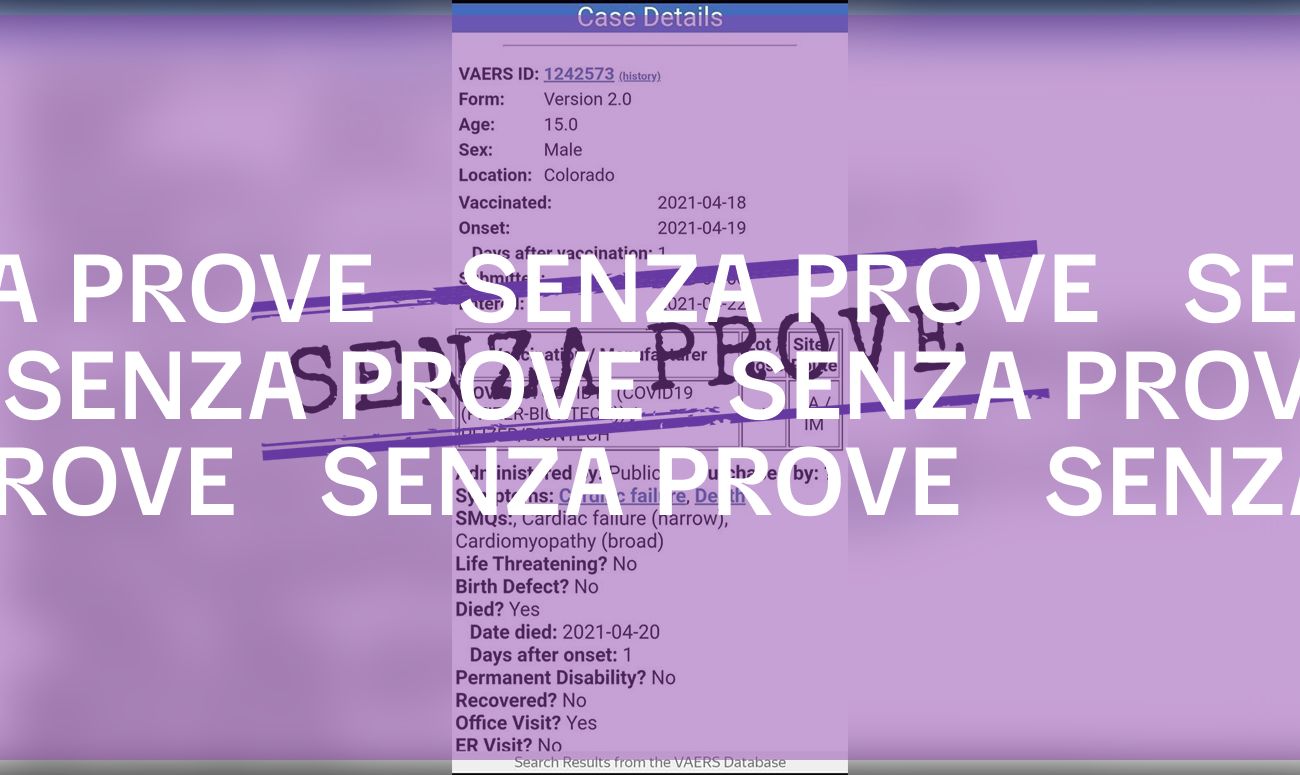 Il 7 giugno 2021 la redazione di Facta ha ricevuto una segnalazione che chiedeva di verificare le informazioni contenute in uno screenshot circolato su Twitter. L’immagine mostra i dettagli del decesso di un quindicenne avvenuto in Colorado (Stati Uniti) il 20 aprile 2021 a causa di un arresto cardiaco, sopraggiunto due giorni dopo l’inoculazione del vaccino Pfizer/BioNTech.