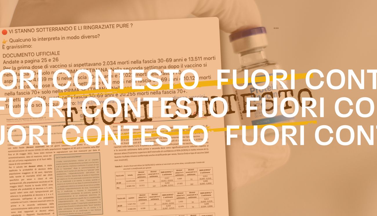 Il 12 luglio 2021 la redazione di Facta ha ricevuto la richiesta di verificare un post pubblicato su Facebook il 9 luglio 2021 e intitolato “Vi stanno sotterrando e li ringraziate pure?”. Il post riporta alcune informazioni contenute nel quinto rapporto di sorveglianza dei vaccini contro la Covid-19 stilato dell’Agenzia italiana del farmaco (Aifa) e pubblicato il 10 giugno 2021. In particolare, fa riferimento alle pagine 25 e 26 affermando che, per esempio, «per la prima dose di vaccino si aspettavano 2.034 morti nella fascia 30-69 anni e 13.511 morti nella fascia 70+ solo nella PRIMA SETTIMANA» o che «nella seconda settimana dopo il vaccino si aspettavano 1.319 morti nella fascia 30-69 anni e 20.255 morti nella fascia 70+». Il contenuto oggetto di analisi sembra quindi intendere che l’Aifa avrebbe già calcolato migliaia di decessi indotti dai vaccini contro la Covid-19.