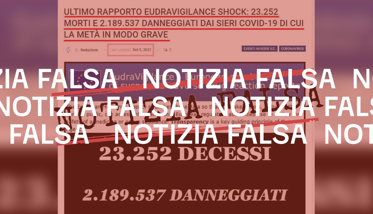 Il 9 settembre 2021 su Facebook è stato pubblicato un post in cui si legge «Ultimo rapporto Eudravigilance shock: 23.252 morti e 2.189.537 danneggiati dai sieri Covid-19 di cui la metà in modo grave». Questi dati, si legge sempre nel post, sarebbero aggiornati al 28 agosto 2021.
