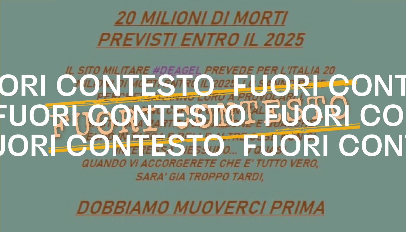 Il 9 dicembre 2021 su Facebook è stato pubblicato un post in cui si legge che «il sito militare #Deagel» avrebbe previsto «per l’Italia 20 milioni di morti entro il 2025». Si legge: «Lo sanno bene perché saranno loro a provocarli, hanno capito che in Italia basta una partita di pallone e qualche euro in tasca e delle altre cose non si interessa nessuno… o quasi, quando vi accorgerete che è tutto vero, sarà già troppo tardi».