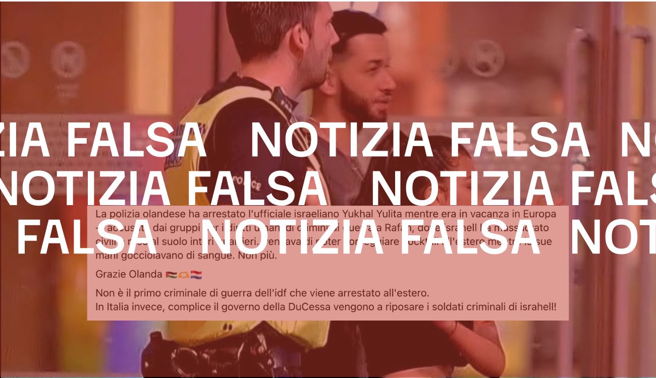 L’11 agosto 2025 su Facebook è stato pubblicato un post in cui si legge che «la polizia olandese ha arrestato l’ufficiale israeliana Yukhal Yulita mentre era in vacanza in Europa — accusata dai gruppi per i diritti umani di crimini di guerra a Rafah», città palestinese nella Striscia di Gaza. Nel post è presente anche una foto che mostra una donna scortata da due agenti di polizia.