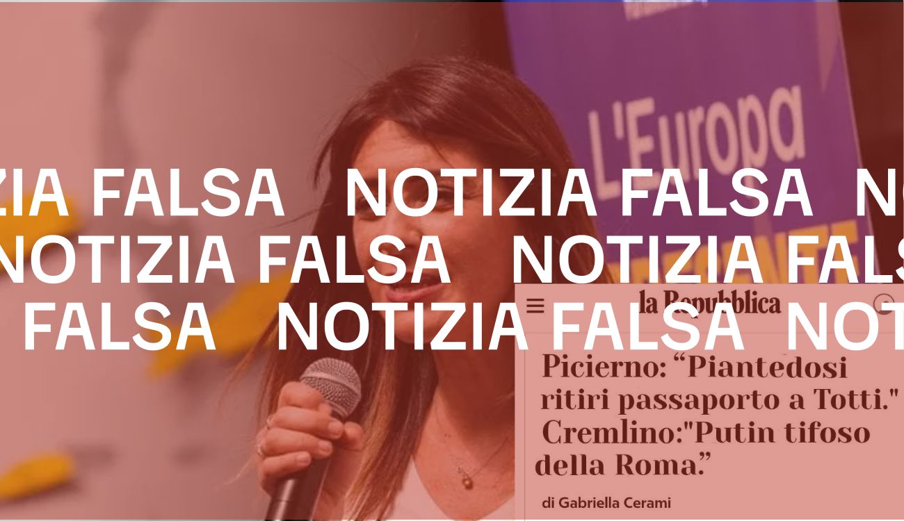 Il 21 marzo 2025 è stato condiviso su Facebook lo screenshot di un presunto articolo pubblicato dal sito web di Repubblica a firma di Gabriella Cerami intitolato: “Picierno: ‘Piantedosi ritiri passaporto a Totti’. Cremlino: Putin tifoso della Roma’”».