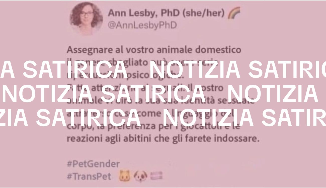 Il 31 ottobre 2024 è stato pubblicato su X lo screenshot di un tweet di «@AnnLesbyPhD» in cui si legge che «assegnare al vostro animale domestico il genere sbagliato può avere serie ripercussioni psicologiche». Dunque, bisognerebbe fare attenzione ai segnali dell’animale, che «dirà la sua identità sessuale attraverso cose come il linguaggio del corpo, la preferenza per i giocattoli e le reazioni agli abitini che gli farete indossare».