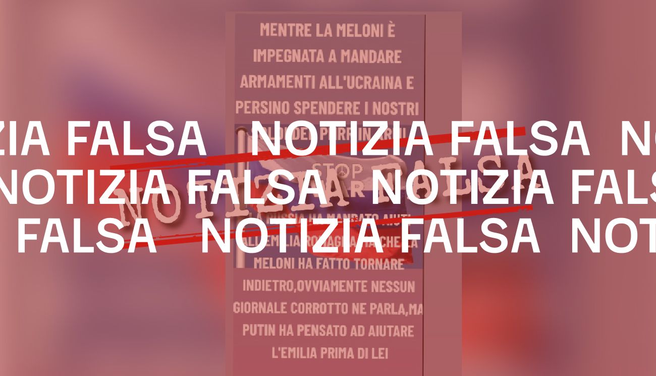 Il 21 luglio 2023 la redazione di Facta.news ha ricevuto una segnalazione via WhatsApp che chiedeva di verificare un video pubblicato il 28 maggio su TikTok. Nel filmato appare l’immagine della bandiera russa, con in sovraimpressione la scritta “Stop war” e un testo che recita: «mentre la Meloni è impegnata a mandare armamenti all’Ucraina e persino spendere i nostri soldi del pnrr in armi, la russia ha mandato aiuti all’Emilia-Romagna». Questi aiuti, si legge ancora, sarebbero stati rifiutati da Meloni e dunque «Putin ha pensato ad aiutare l’Emilia prima di lei».