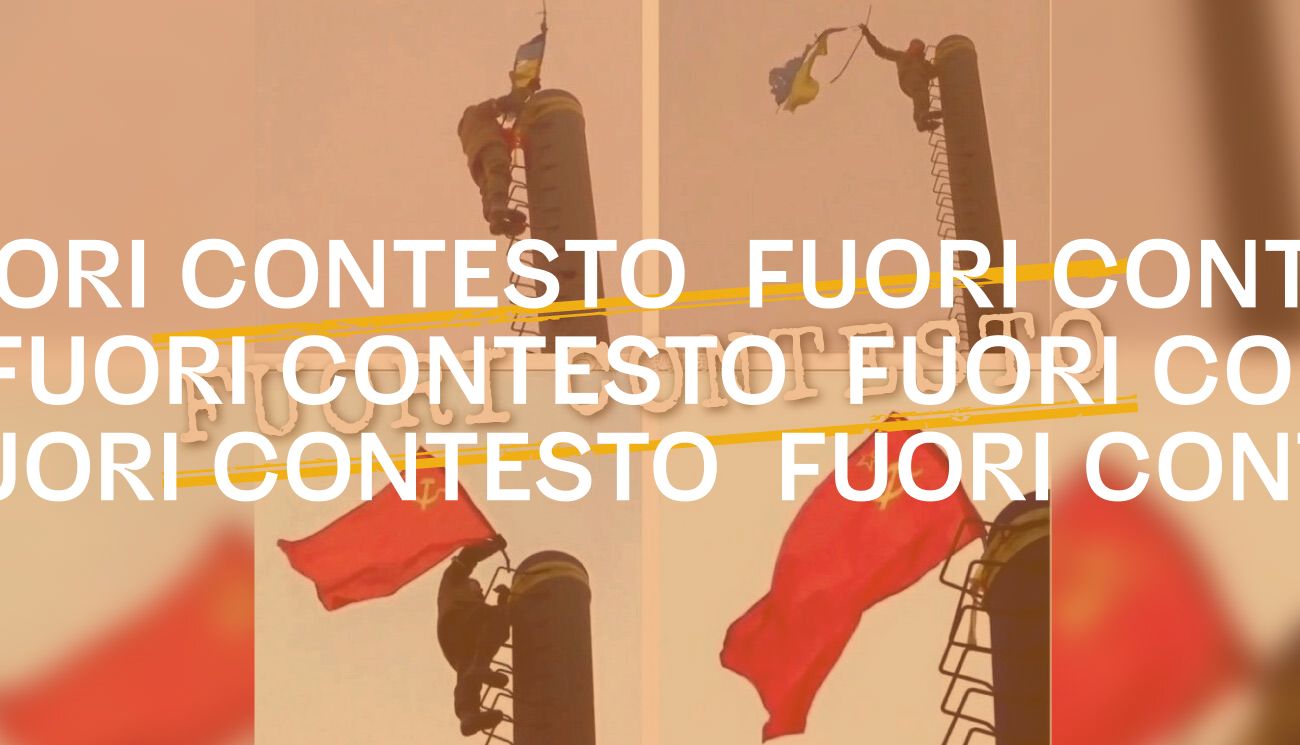 Il 18 aprile 2022 su Facebook è stato pubblicato un post contenente una sequenza di quattro foto che mostrano un uomo togliere una bandiera dell’Ucraina da una ciminiera e sostituirla con una bandiera dell’ex Unione sovietica. Le immagini sono accompagnate da questo commento, scritto da chi ha pubblicato il post su Facebook: «Intanto a Mariupol… Bandiera dell’ex unione sovietica, che sta a significare che è stata liberata, come hanno fatto a Berlino nel 45».