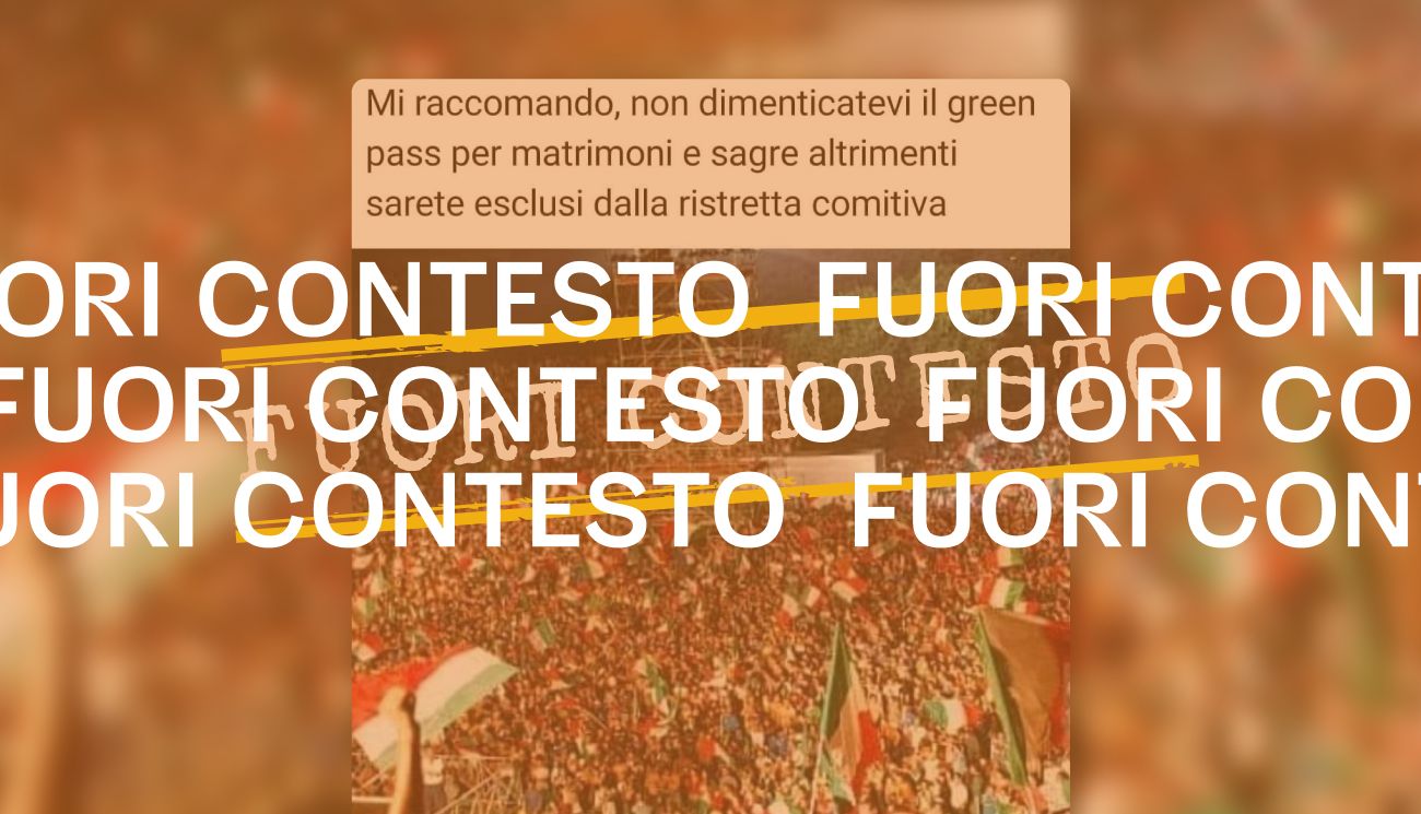 Il 12 luglio 2021 su Facebook è stata pubblicata la foto di una grande folla di tifosi con numerose bandiere dell’Italia. L’immagine è accompagnata da questo commento: «Mi raccomando non dimenticatevi il green pass per matrimoni e sagre altrimenti sarete esclusi dalla ristretta comitiva».