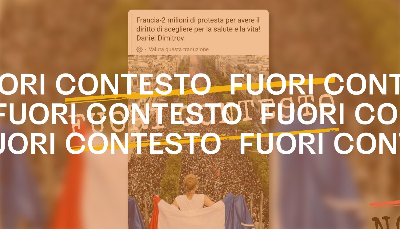 Il 18 luglio 2021 su Facebook è stata pubblicata una foto che mostra una folla lungo i viali degli Champs-Elysées a Parigi (Francia) e una ragazza, più vicina all’inquadratura, con una bandiera francese sulle spalle. L’immagine è accompagnata da questo commento: «Francia-2 milioni di protesta per avere il diritto a scegliere per la salute e la vita!». Il riferimento è alle manifestazioni di protesta svoltesi il 17 luglio in diverse città in Francia dopo l’annuncio del presidente della Repubblica Emmanuel Macron di estendere l’uso del green pass per poter frequentare luoghi di svago e di cultura.
