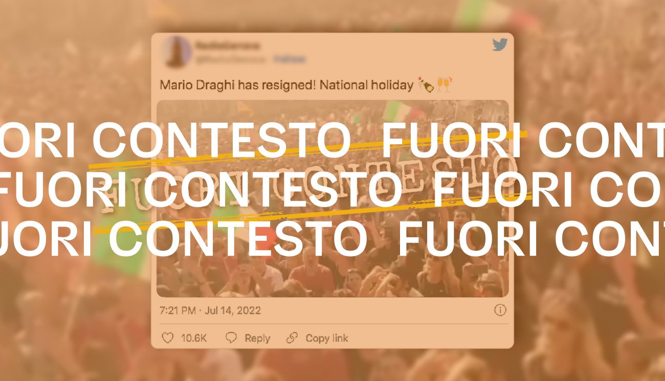 Si tratta di un contenuto pubblicato senza il contesto necessario alla sua comprensione, che veicola una notizia falsa. Il video che stiamo analizzando non è stato girato il 14 luglio 2022 e non mostra le manifestazioni avvenute in occasione delle dimissioni di Mario Draghi.