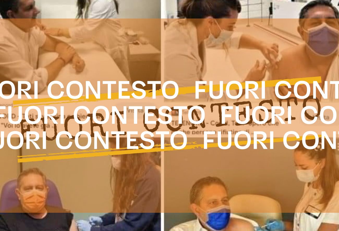 La foto in alto a sinistra è stata pubblicata dal governatore sulla propria pagina facebook il 14 novembre 2019 e mostra la somministrazione del vaccino antinfluenzale, come si può verificare qui e qui. La foto in alto a destra è stata pubblicata da Toti su Facebook il 6 ottobre 2020 e anche in questo caso si tratta del vaccino antinfluenzale, come si può vedere qui.