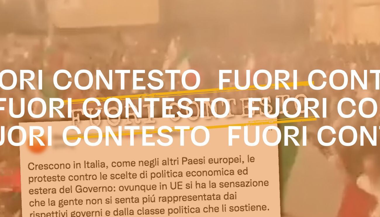 L’11 luglio 2022 è stato pubblicato un tweet contenente un video di 17 secondi che mostra una folla di manifestanti mentre intona un coro e sventola delle bandiere italiane. Il filmato è accompagnato da un commento, scritto dall’autore del tweet, in cui si legge: «Crescono in Italia, come negli altri Paesi europei, le proteste contro le scelte di politica economica ed estera del Governo: ovunque in UE si ha la sensazione che la gente non si senta piú rappresentata dai rispettivi governi e dalla classe politica che li sostiene».