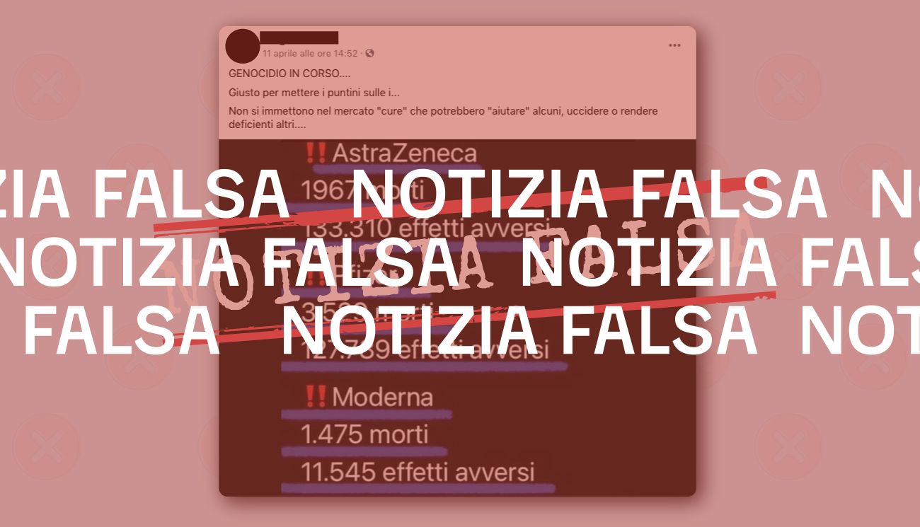 L’11 aprile 2021 su Facebook è stata pubblicata un’immagine in cui si legge che il vaccino contro il nuovo coronavirus Sars-CoV-2 prodotto da AstraZeneca avrebbe causato 1.967 morti e oltre 133 mila reazioni avverse, quello prodotto dalla casa farmaceutica Pfizer 3.529 decessi e poco meno di 130 mila reazioni avverse e il vaccino di Moderna avrebbe prodotto il decesso di 1.475 persone e 11.545 effetti avversi. L’immagine è accompagnata da questo testo, scritto da chi ha pubblicato il post su Facebook: «GENOCIDIO IN CORSO….Giusto per mettere i puntini sulle i…Non si immettono nel mercato “cure” che potrebbero “aiutare” alcuni, uccidere o rendere deficienti altri….».