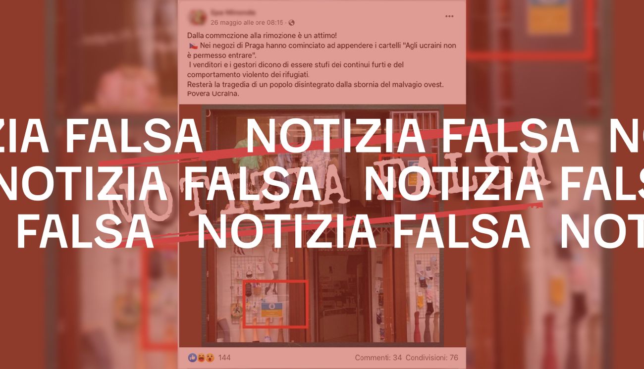 Il 26 maggio 2022 su Facebook sono state pubblicate due foto che mostrano le vetrine di due negozi con all’esterno affisso lo stesso cartello , colorato come la bandiera ucraina e contenente una mano a significare «Alt». Le immagini sono accompagnate da questo commento, scritto da chi ha pubblicato il post su Facebook: «Dalla commozione alla rimozione è un attimo! Nei negozi di Praga hanno cominciato ad appendere i cartelli “Agli ucraini non è permesso entrare”. I venditori e i gestori dicono di essere stufi dei continui furti e del comportamento violento dei rifugiati. Resterà la tragedia di un popolo disintegrato dalla sbornia del malvagio ovest. Povera Ucraina».
