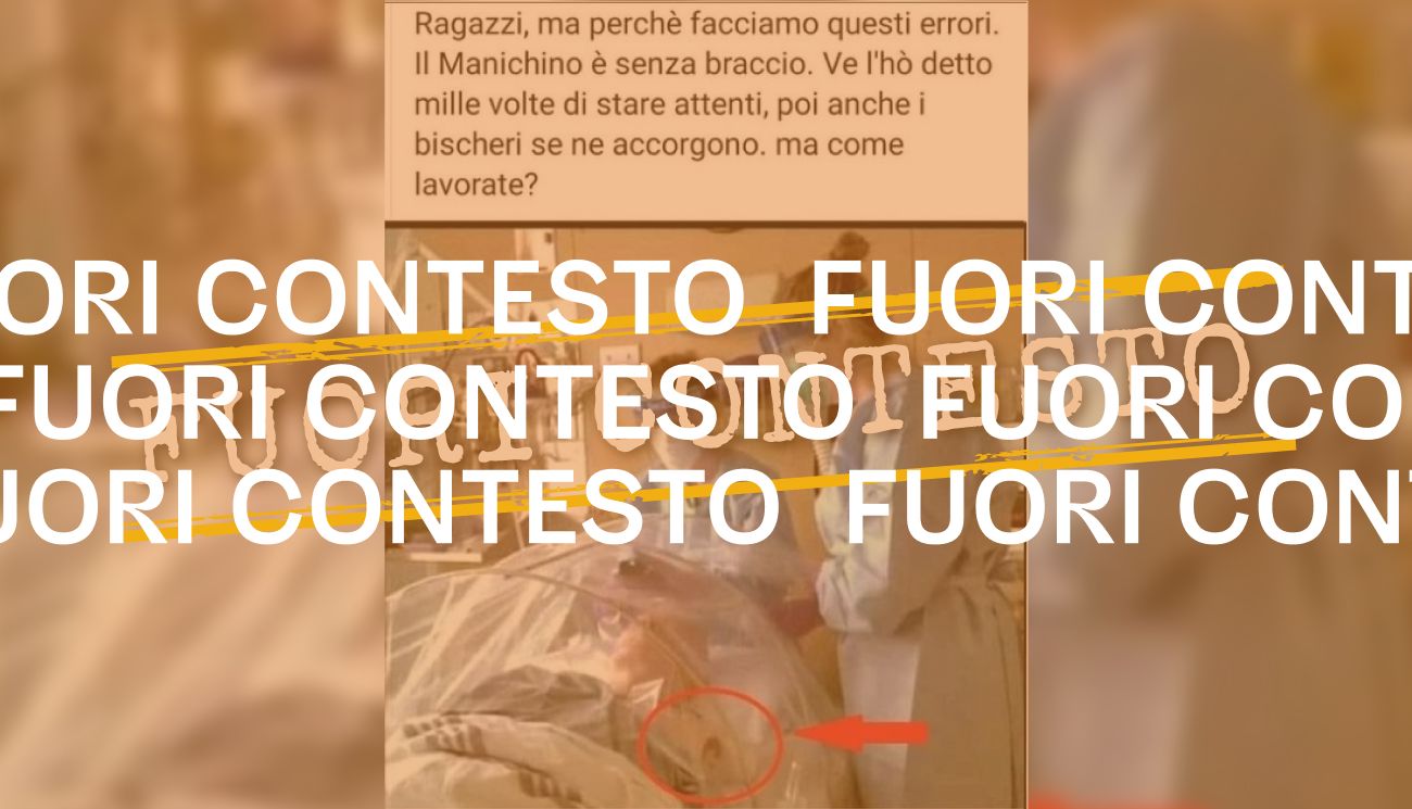 L’immagine oggetto della segnalazione è accompagnata da un testo in cui si legge: «Ragazzi, ma perché facciamo questi errori. Il manichino è senza braccio. Ve l’hò detto mille volte di stare attenti, poi anche i bischeri se ne accorgono. ma come lavorate?». L’autore del commento dà dunque per scontato che l’immagine sia stata utilizzata per illustrare lo sforzo del personale sanitario per combattere gli effetti della pandemia da Covid-19.