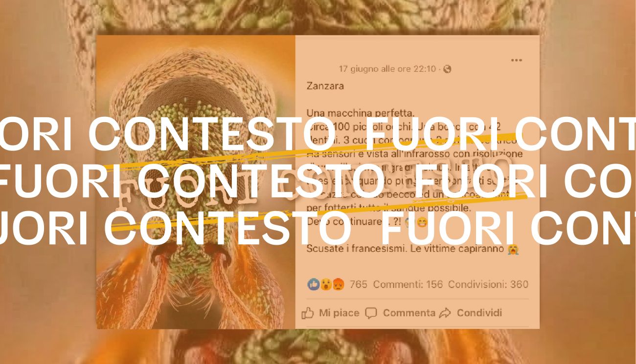 Il 27 giugno 2022 la redazione di Facta ha ricevuto una segnalazione che chiedeva di verificare l’autenticità di una foto pubblicata il 17 giugno 2022 su Facebook. L’immagine mostra il primo piano di un insetto verde con il corpo arancione ed è accompagnata da un testo, scritto dall’autore del post, in cui si legge: «Zanzara. Una macchina perfetta. Circa 100 piccoli occhi. Una bocca con 42 dentini. 3 cuori con ognuno 2 atri e 2 ventricoli. Ha sensori e vista all’infrarosso con risoluzione di un millesimo di gradi Celsius. Inietta un anestetico quando punge per non farti sentire un cazzo col suo becco ed un anticoagulante per fotterti tutto il sangue possibile. Devo continuare… ?! Scusate i francesismi. Le vittime capiranno».