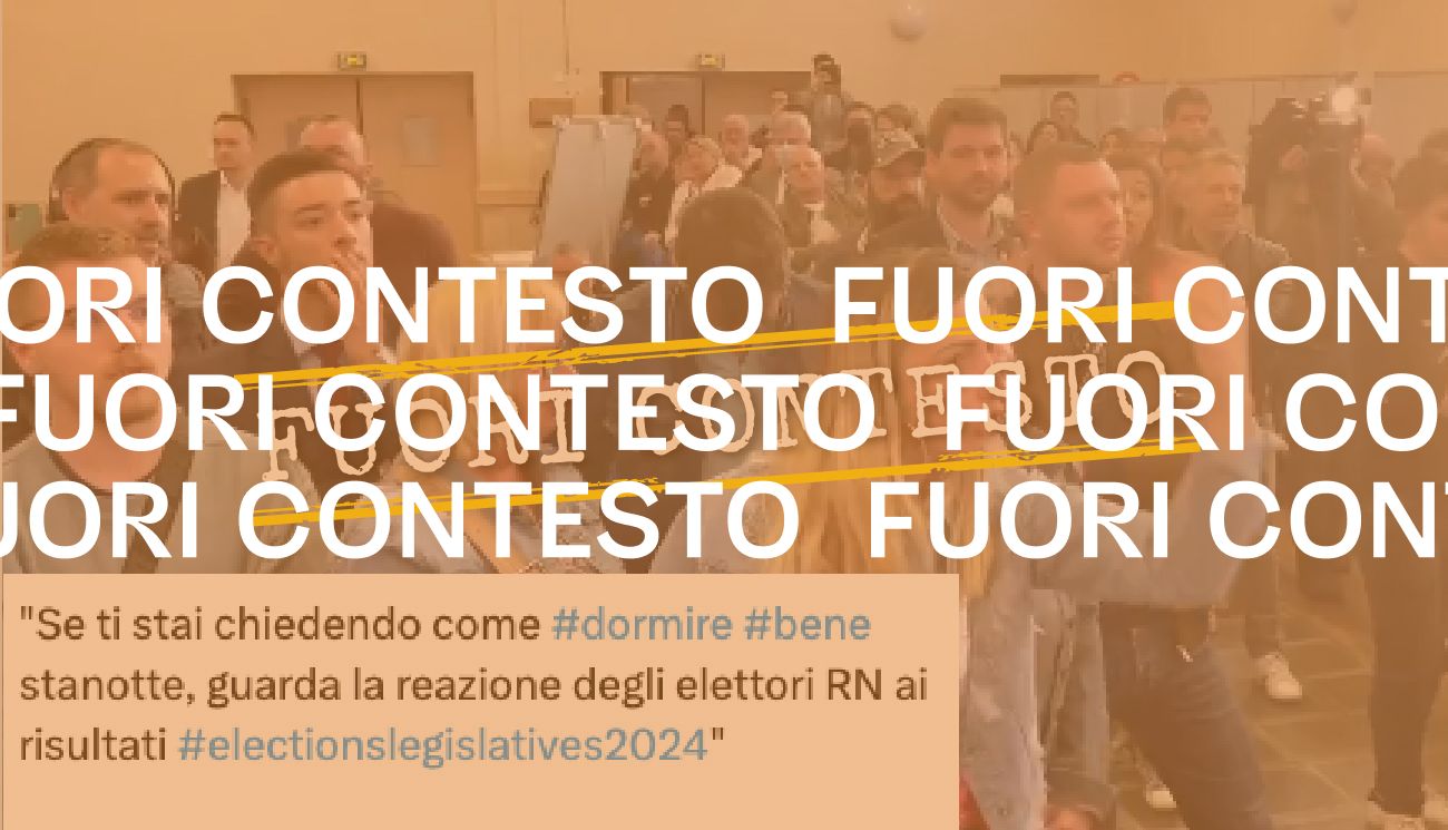L’8 luglio 2024 è stato pubblicato un video su X che mostra un gruppo di persone in una stanza che guarda nella stessa direzione in ansia e con aria di attesa, per poi reagire in maniera arrabbiata e agitata. Secondo chi l’ha condiviso, si tratta della «reazione degli elettori RN ai risultati» delle elezioni legislative 2024 in Francia.