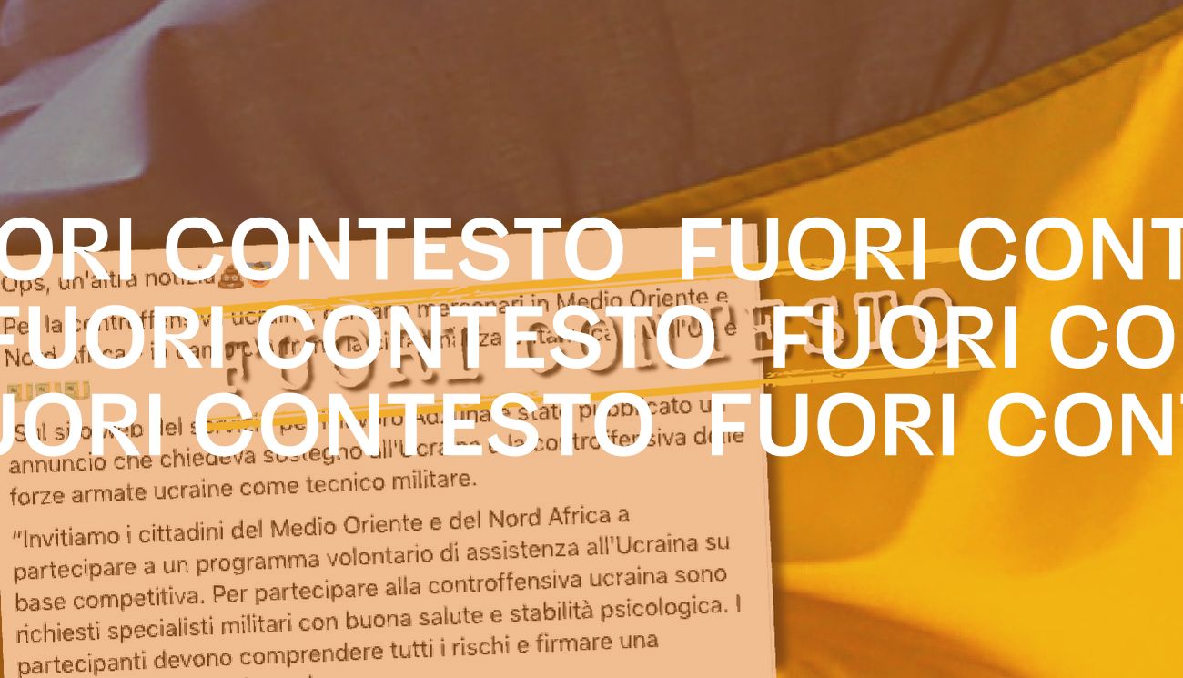Il 22 maggio 2023 è stato pubblicato su Facebook lo screenshot di un presunto messaggio in inglese su Adzuna, un motore di ricerca per annunci di lavoro di una società con sede a Londra. Nel messaggio si parla dell’offerta di un posto di lavoro per «cittadini del Medio Oriente e del Nord Africa» come «specialisti militari con buona salute e stabilità psicologica» a sostegno dell’esercito ucraino. «Dopo la scadenza del contratto e la verifica del rispetto dei requisiti, viene garantita la cittadinanza accelerata nel Regno Unito o nell’Ue», si legga ancora nell’annuncio, che fornisce un indirizzo email da contattare: «eu.citizen.programme@gmail.com».