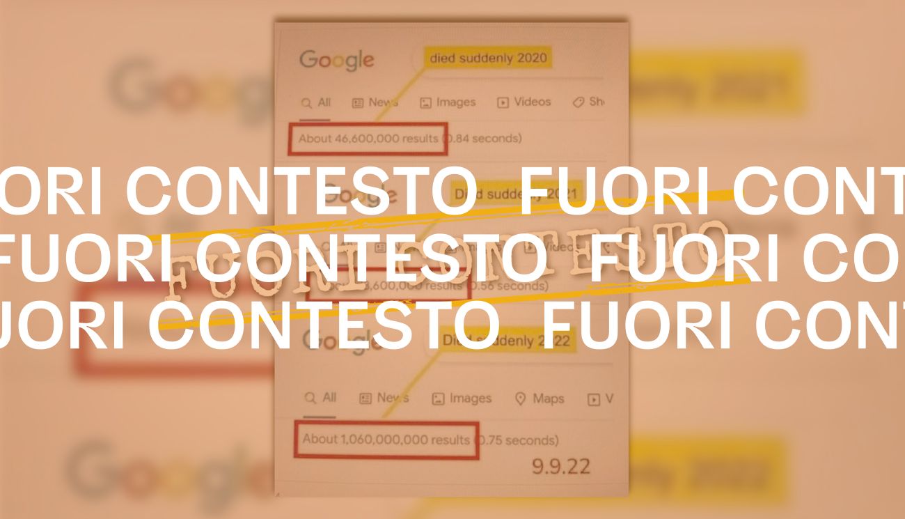 Il 28 novembre 2022 la redazione di Facta ha ricevuto una segnalazione che chiedeva di verificare le informazioni contenute in un’immagine che mette a confronto gli screenshot di tre diverse ricerche Google. Le tre ricerche riguardano le parole “died suddenly” (morto improvvisamente in inglese), accompagnate rispettivamente dagli anni 2020, 2021 e 2022.
