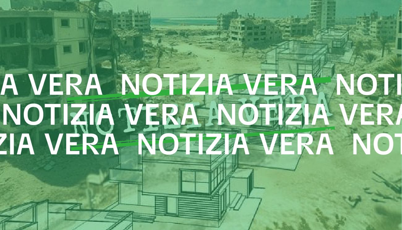 Il 19 dicembre 2023 la redazione di Facta ha ricevuto una segnalazione via WhatsApp che chiedeva di verificare un’immagine pubblicata lo stesso giorno su Facebook che mostra un paesaggio con il mare sullo sfondo in cui sono presenti edifici semidistrutti affiancati da cinque progetti in 3D di nuove abitazioni. Nella foto è presente anche una scritta in ebraico che recita: «una casa sulla spiaggia non è un sogno!».