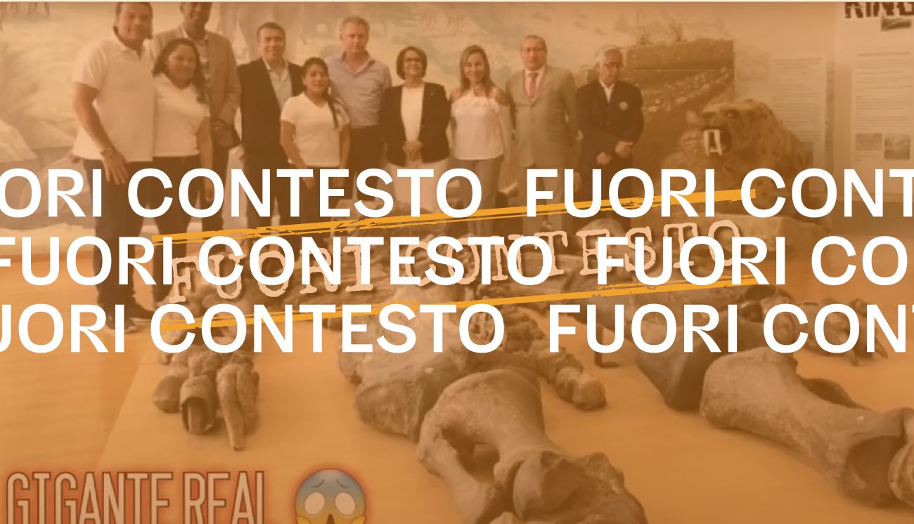 Lo scheletro raffigurato nel filmato è realmente esposto al museo paleontologico Megatario dell’università statale della penisola di Santa Elena (Upse), in Ecuador. Non si tratta, però, delle ossa di un gigante, come erroneamente affermato nel contenuto che stiamo analizzando. Come si può leggere nella didascalia della foto (numero cinque della fotogallery) pubblicata sul sito ufficiale del museo, quello mostrato nel video è lo scheletro di un bradipo gigante, conosciuto con il nome scientifico di Eremotherium laurillardi, alto circa 4 metri e vissuto in Ecuador. Questa specie di bradipo è vissuta nell’epoca geologica pleistocene e si trovava nel continente americano fino a circa 10 mila anni fa.
