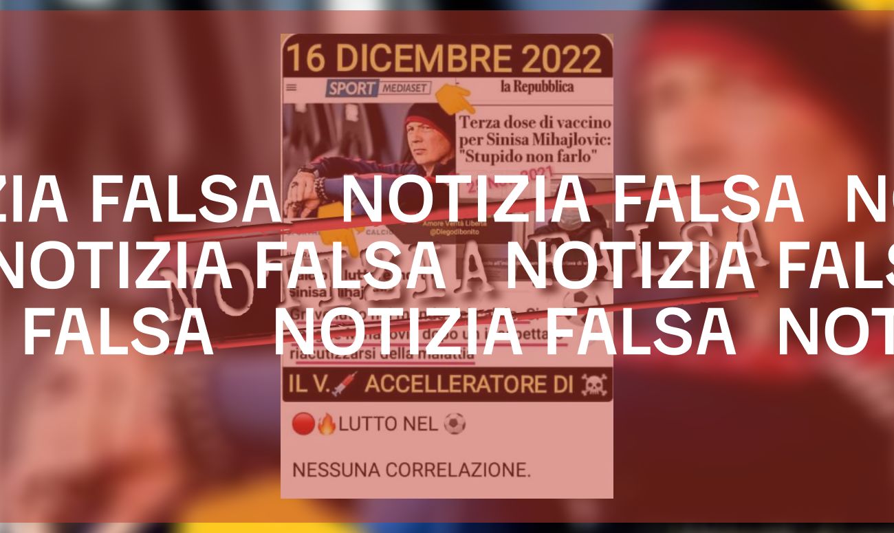 Il 16 dicembre 2022 su Facebook è stato pubblicato lo screenshot di un messaggio pubblicato su Telegram. Nel testo si legge la notizia del decesso dell’ex calciatore e allenatore serbo Siniša Mihajlović, avvenuto il 16 dicembre 2022. Compare anche un ritaglio di un titolo di giornale, datato 25 novembre 2021, in cui si legge che il calciatore aveva fatto la terza dose di vaccino anti Covid-19. Nello stesso messaggio si leggono anche le scritte «il v. acceleratore di morte» e «lutto nel calcio. Nessuna correlazione».