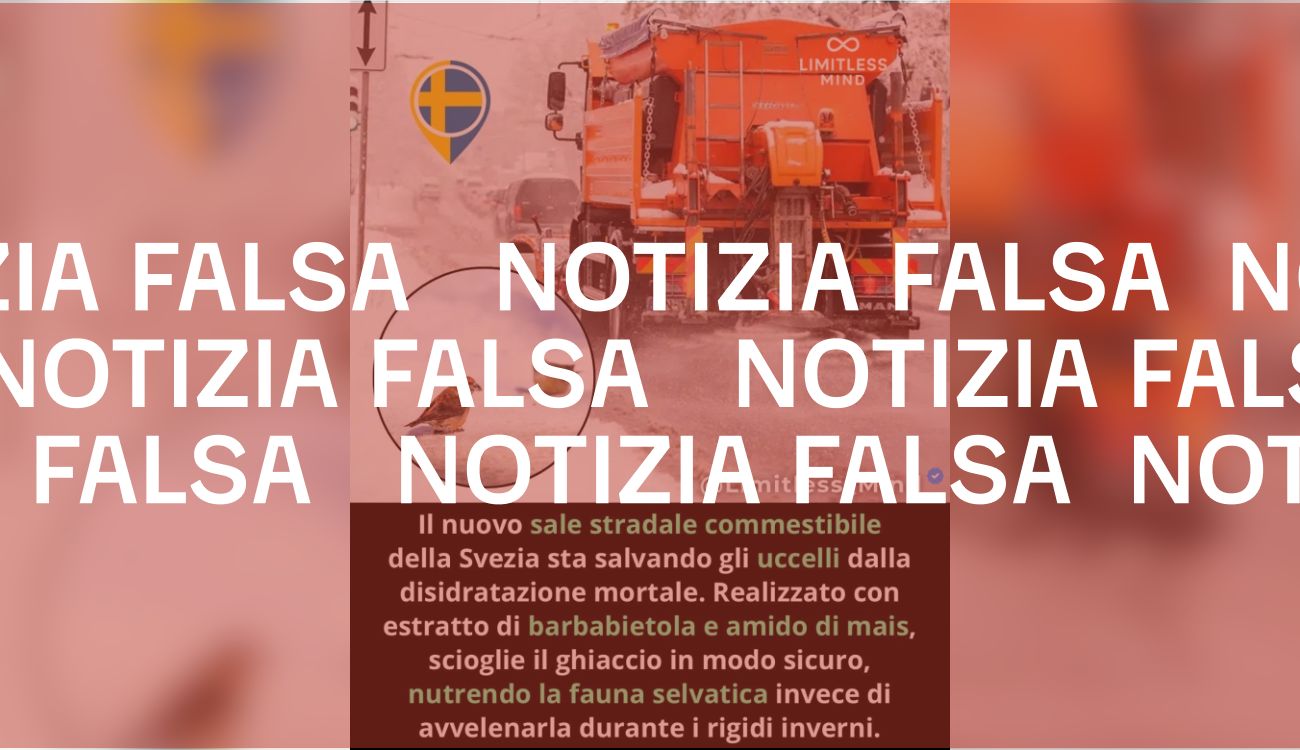Il 14 novembre 2025 è stato pubblicato su Facebook un post in cui si legge che la Svezia starebbe utilizzando un «nuovo sale stradale commestibile» per «salvare gli uccelli dalla disidratazione mortale». Il sale, si legge, è «realizzato con estratto di barbabietola e amido di mais, scioglie il ghiaccio in modo sicuro, nutrendo la fauna selvatica invece di avvelenarla durante i rigidi inverni». Il post continua specificando che questa nuova soluzione avrebbe «un colore rossastro (derivato dai pigmenti della barbabietola)» che «renderebbe inoltre le zone ghiacciate più visibili ai conducenti, riducendo gli incidenti».