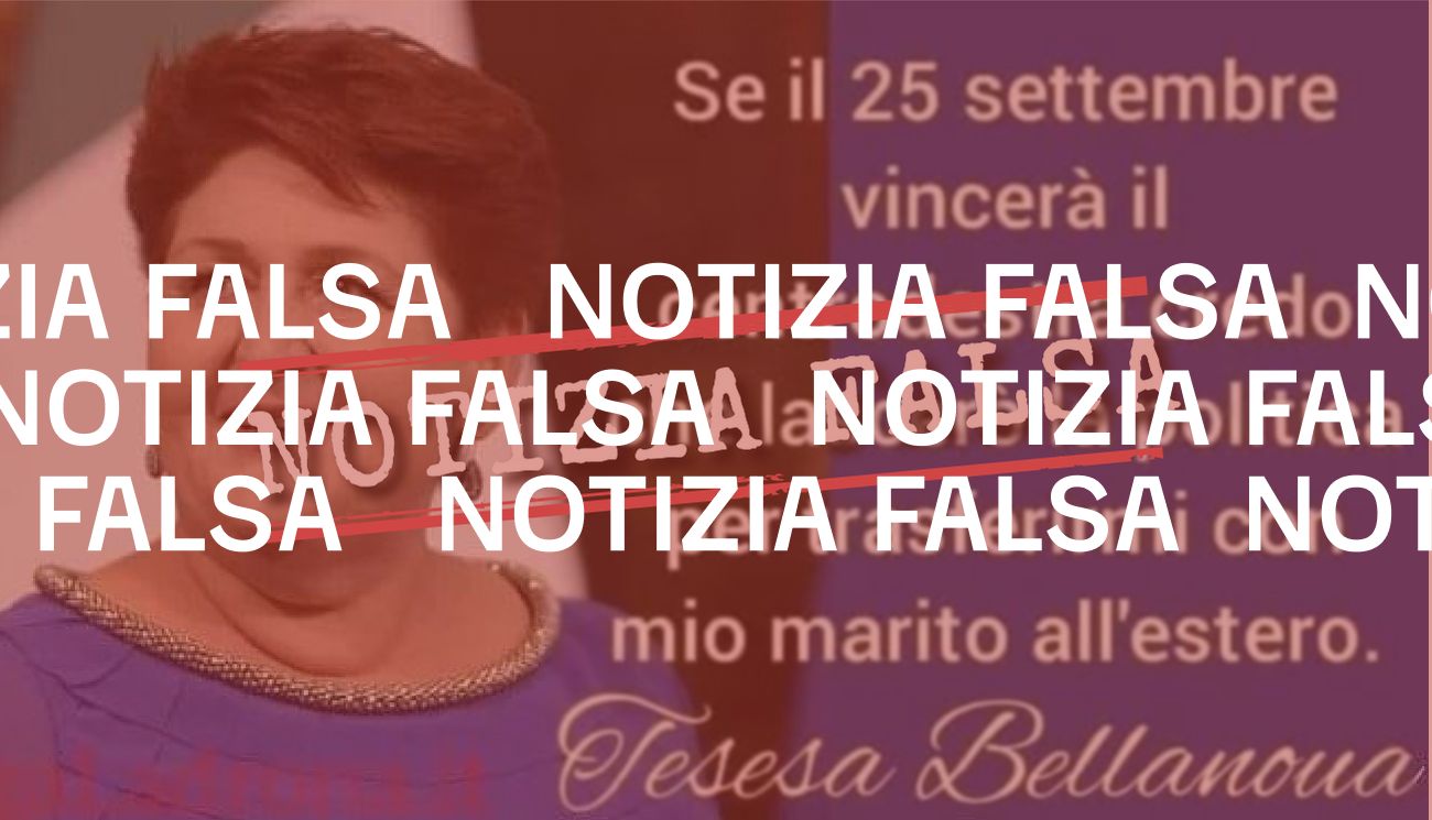 Il 13 settembre 2022 su Facebook è stata pubblicata un’immagine di Teresa Bellanova, contenente una sua presunta dichiarazione. La senatrice di Italia Viva avrebbe dichiarato: «Se il 25 settembre vincerà il centrodestra, credo che lascerò la politica per trasferirmi con mio marito all’estero».