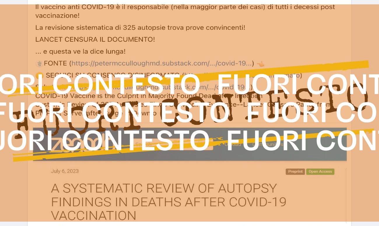 Il 16 luglio 2023 è stato pubblicato su Facebook un post in cui si legge che la rivista scientifica The Lancet avrebbe censurato una revisione sistematica, basata sull’analisi di «325 autopsie», in cui sarebbero state trovate «prove convincenti» che il «vaccino anti COVID-19 è il responsabile (nella maggior parte dei casi) di tutti i decessi post vaccinazione!».
