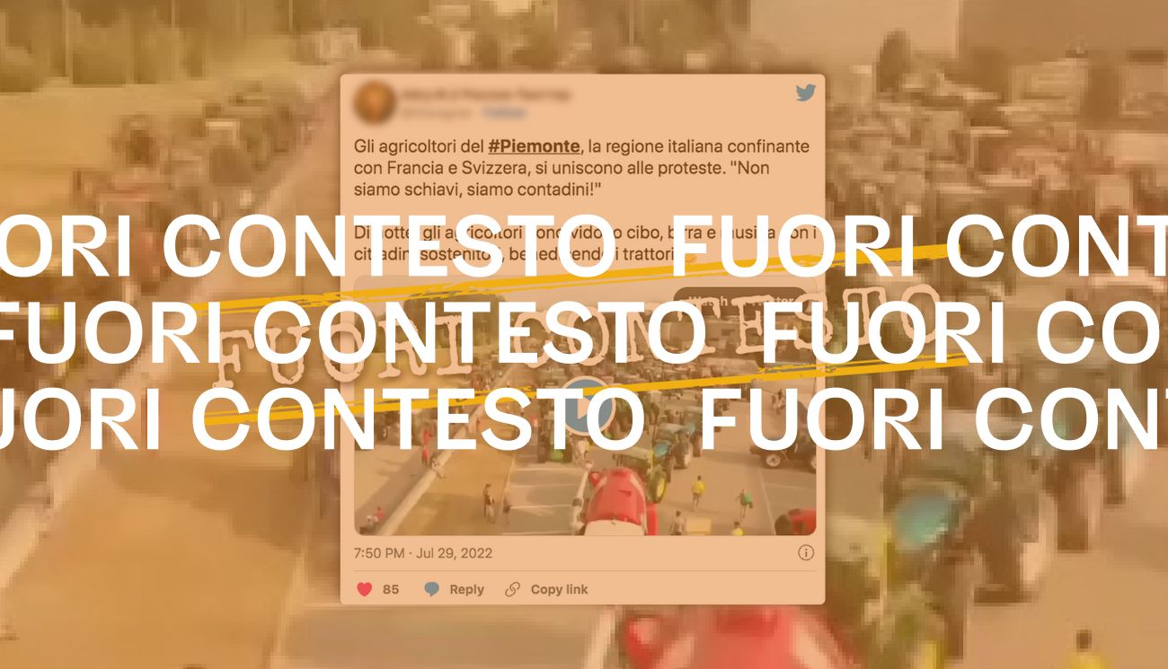 Il filmato è accompagnato da un commento, scritto dall’autrice del tweet, che recita: «Gli agricoltori del #Piemonte, la regione italiana confinante con Francia e Svizzera, si uniscono alle proteste. “Non siamo schiavi, siamo contadini!” Di notte, gli agricoltori condividono cibo, birra e musica con i cittadini sostenitori, benedicendo i trattori».