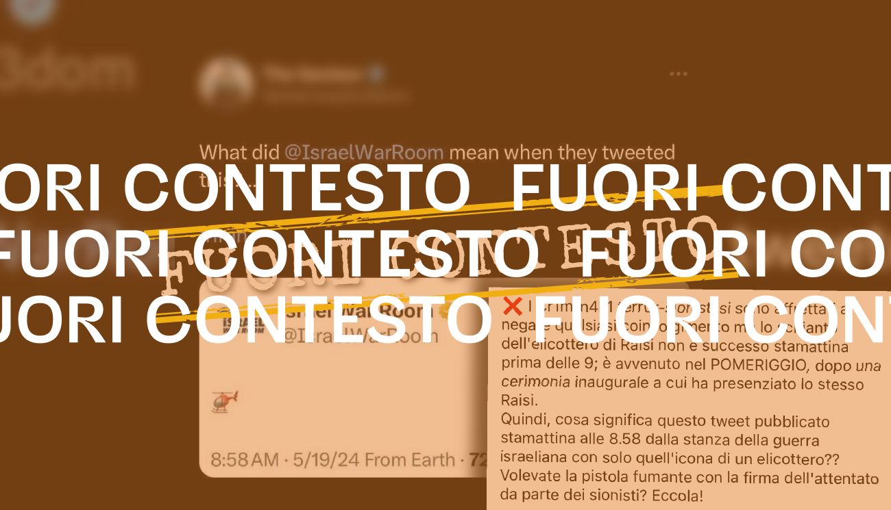 Il 19 maggio 2024 su Facebook è stato pubblicato lo screenshot di un presunto post su X dell’account Israel War Room pubblicato il 19 maggio 2024 alle ore «8:58 AM» (cioè del mattino) che contiene l’emoticon di un elicottero.