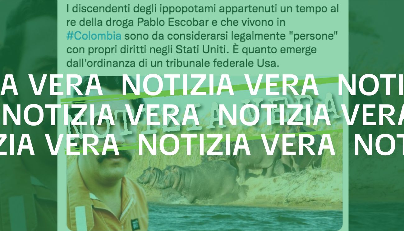 Il 26 ottobre 2021 è stato pubblicato un tweet contenente una foto del narcotrafficante colombiano Pablo Escobar accanto ad alcuni ippopotami. L’immagine è accompagnata da un testo, scritto dall’autore, in cui si legge: «I discendenti degli ippopotami appartenuti un tempo al re della droga Pablo Escobar e che vivono in #Colombia sono da considerarsi legalmente “persone” con propri diritti negli Stati Uniti. È quanto emerge dall’ordinanza di un tribunale federale Usa».