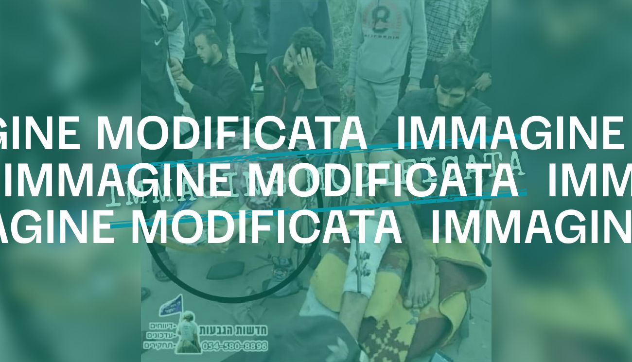 Come si può notare dal video originale, l’uomo sulla sinistra dello schermo non ha tre gambe, ma due. L’immagine è stata poi modificata digitalmente, ed è stata aggiunta una terza gamba per veicolare disinformazione contro i palestinesi feriti in foto.