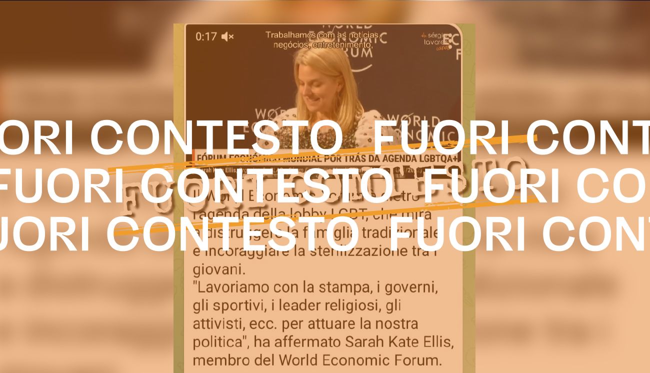 Il 1° ottobre 2023 la redazione di Facta.news ha ricevuto una segnalazione via WhatsApp che chiedeva di verificare un post pubblicato su Facebook tre giorni prima. Nel contenuto social è presente lo screenshot di un messaggio Telegram secondo cui «il World Economic Forum è dietro l’agenda della lobby LGBT, che mira a distruggere la famiglia tradizionale e incoraggiare la sterilizzazione tra i giovani». Per portare avanti questo piano, si legge nel testo, Sarah Kate Ellis, «membro del World Economic Forum», avrebbe confermato di lavorare «con la stampa, i governi, gli sportivi, i leader religiosi, gli attivisti ecc. per attuare la nostra politica».