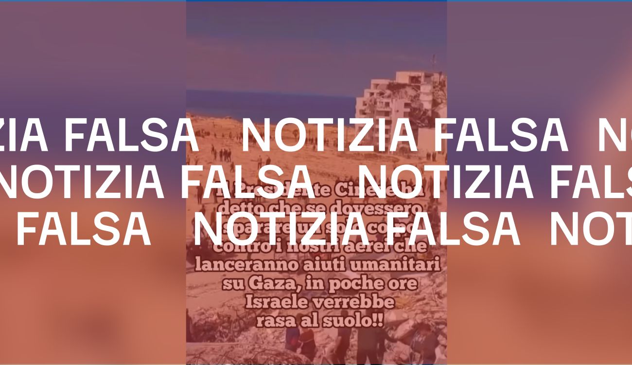 In sovrimpressione compare un testo in italiano che recita: «Il Presidente Cinese ha detto che se dovessero sparare un solo colpo contro i nostri aerei che lanceranno aiuti umanitari su Gaza, in poche ore Israele verrebbe rasa al suolo!!».