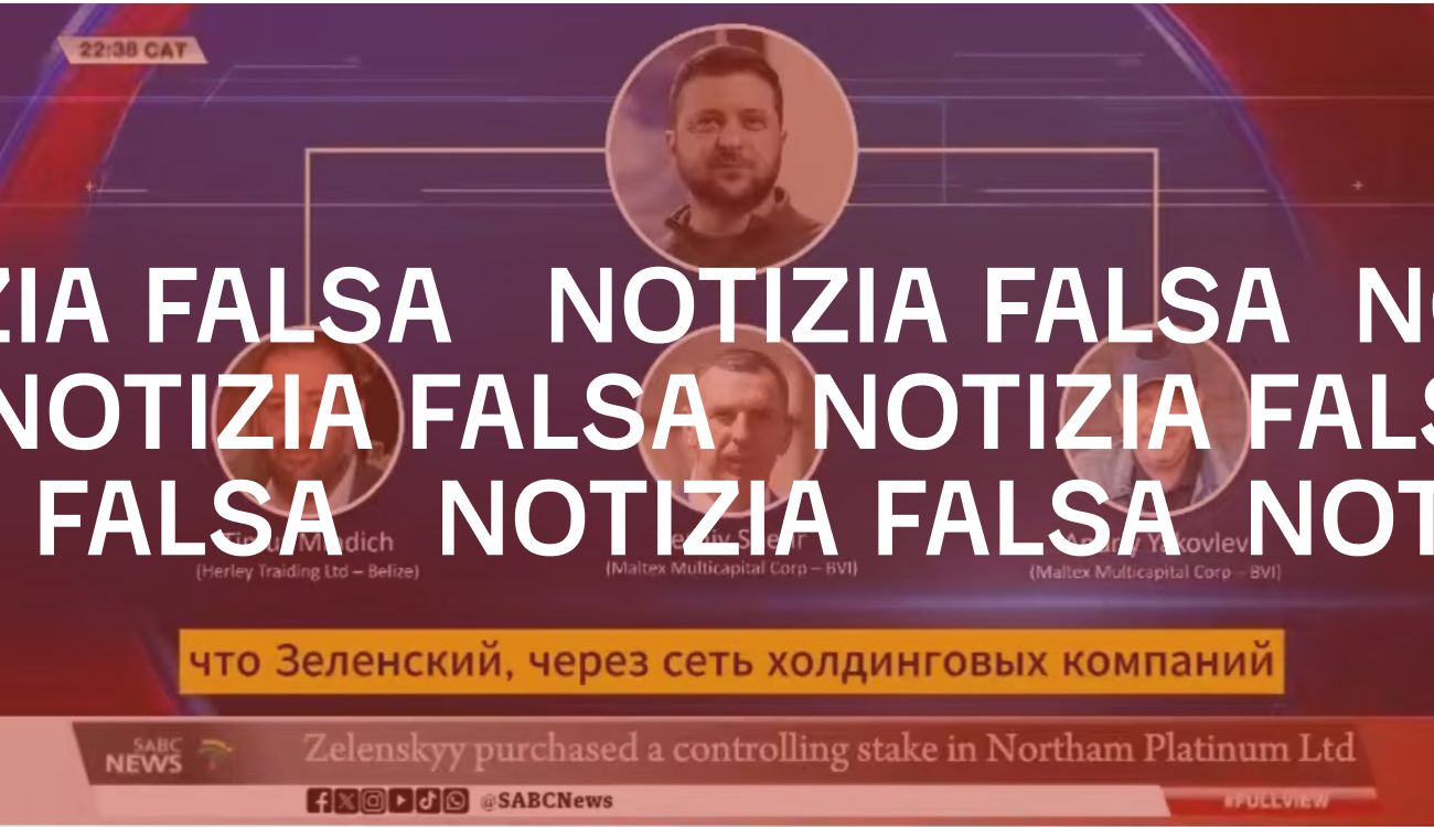 Il 5 aprile 2025 è stato pubblicato su Facebook un presunto servizio video dell’emittente sudafricana Sabc News in cui si afferma che il presidente ucraino Volodymyr Zelensky avrebbe acquistato una quota del 51 del cento, del valore di 1,6 miliardi di dollari, della Northam Platinum, tra le principali società minerarie del Sudafrica.
