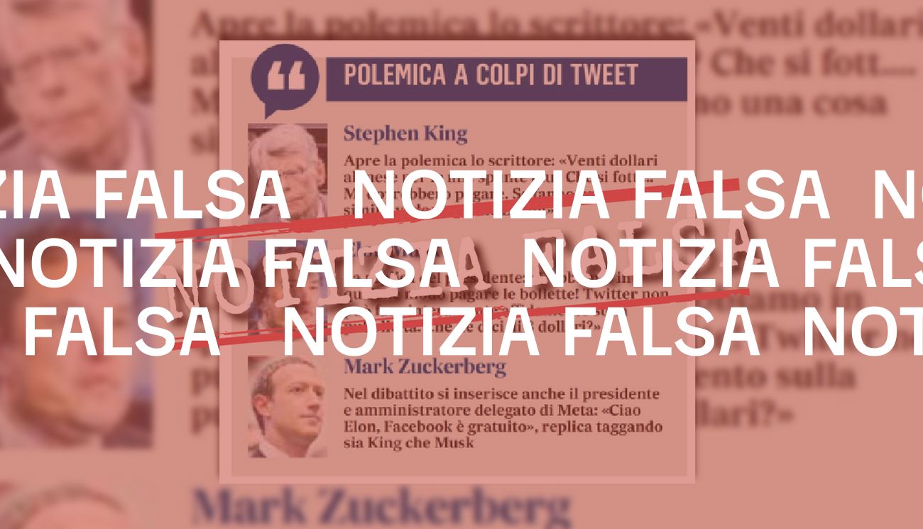 In questo contesto si è inserita l’opinione di Stephen King, che il 31 ottobre si è scagliato contro la decisione di Musk, come correttamente riportato da Il Messaggero. Reale è anche la risposta dello stesso Musk, che il 1° novembre ha sottolineato la necessità di dover «pagare le bollette». L’account Twitter del presidente di Meta Mark Zuckerberg non è invece intervenuto nella discussione, come si può verificare scorrendo le risposte a questo tweet.