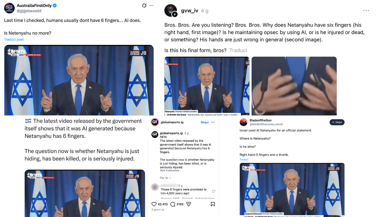 Subito dopo la diffusione del filmato, svariati account social hanno iniziato a diffondere fotogrammi per sostenere che il video della conferenza fosse un falso generato con l’intelligenza artificiale, generando milioni di visualizzazioni. Le prove sarebbero state alcune incongruenze tipiche dell’IA presenti in queste immagini. Secondo la più citata, una delle mani del primo ministro israeliano appare con sei dita. Questo contenuto è stato rilanciato anche dall’account Instagram @eye.on.palestine, con 13,5 milioni di follower, che prima ha ripubblicato la presunta notizia per poi rimuoverla, ha ricostruito il sito di fact-checking statunitense Snopes.