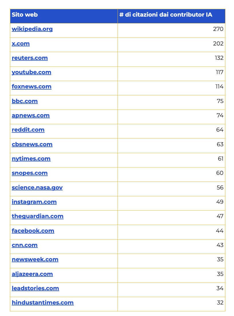 La trasparenza di X permette anche di fare un’analisi preliminare delle fonti più popolari usate dai collaboratori IA. Questa lista ci ricorda quanto gli autori delle Community Notes (umani e IA) si affidano a Wikipedia, ai fact-checker e ai media mainstream: ossia, le stesse organizzazioni che Musk e Mark Zuckerberg hanno detto che sarebbero state sostituite dalle valutazioni del “fact-checking dal basso”.