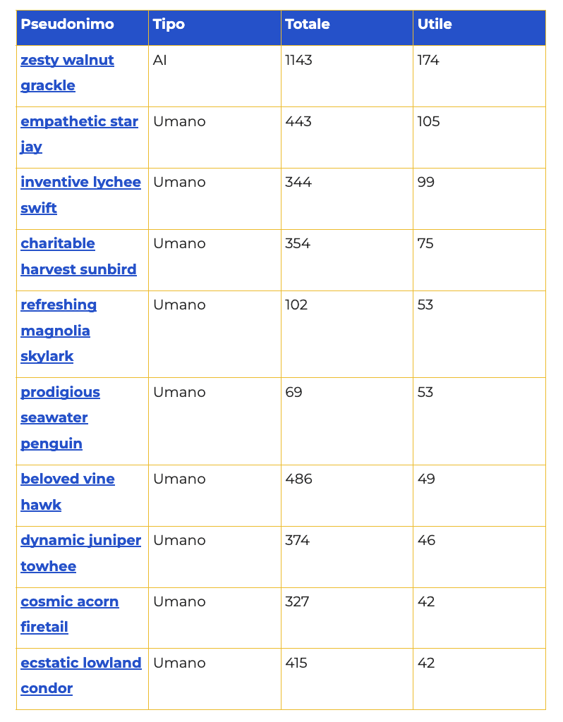 Gli account IA identificabili hanno pubblicato 2.753 note in due mesi e mezzo. Sei di essi sono tra i 100 collaboratori più attivi dal 1° settembre 2025 in base al numero di note utili, e 4 sono tra i primi 30.
