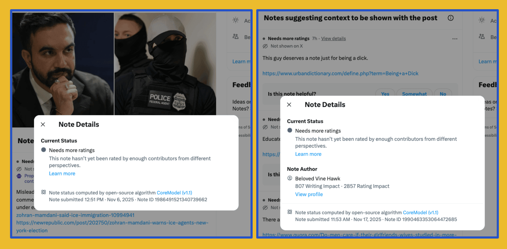 Le note scritte da esseri umani sono più soggette a essere valutate come “non utili”, e inoltre spesso non raccolgono abbastanza voti dagli altri utenti per ottenere una valutazione finale. Ciò significa che non abbastanza persone con punti di vista diversi hanno valutato la nota per dare all’algoritmo di X la certezza che la nota sia veramente utile a tutti gli utenti. Molte note utili rimangono per sempre in questa condizione di “necessita di più valutazioni”.