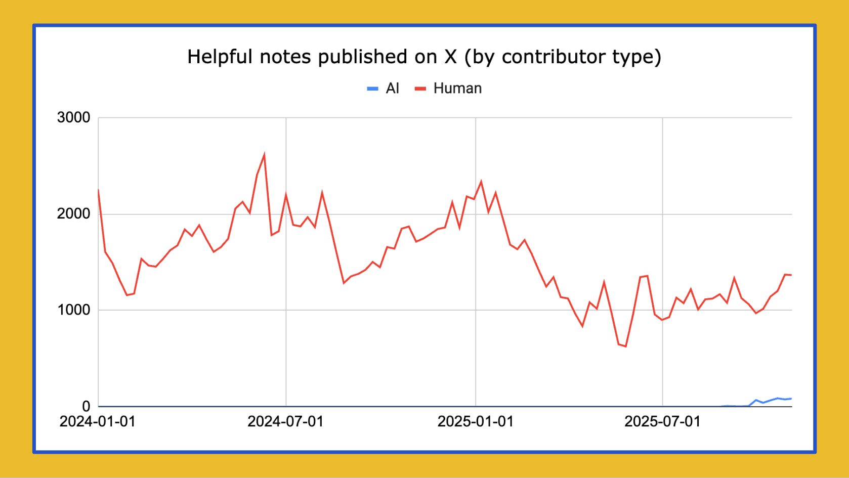 La scorsa settimana, C.J. Robinson ha scritto sulla Columbia Journalism Review che gli autori IA delle note hanno rappresentato tra il 5 e il 10 per cento di tutte le note utili da settembre 2025.