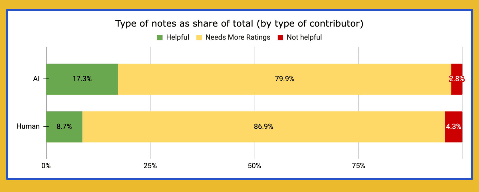 Inoltre, le note dei collaboratori IA hanno molte più probabilità di essere considerate “utili” e quindi mostrate agli utenti su X. Dal 1° settembre, il 17,3 per cento di tutte le note scritte con l’intelligenza artificiale è stato considerato utile, in confronto all’8,7 per cento di quelle scritte da esseri umani.