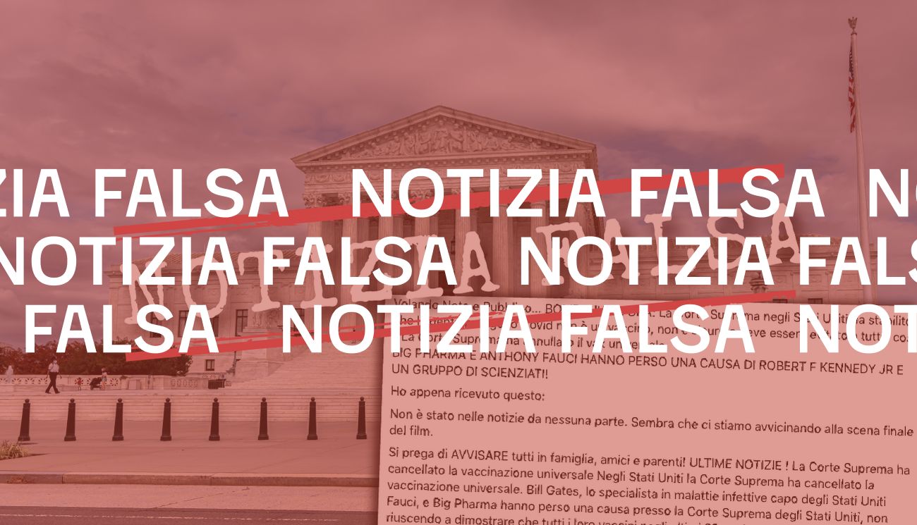 Il 29 marzo 2021 su Facebook è stato pubblicato un post in cui si legge che Bill Gates, co-fondatore di Microsoft e filantropo, Anthony Fauci, direttore del National Institute of Allergy and Infectious Disease (l’istituto americano che si occupa di allergie e malattie infettive) e le industrie farmaceutiche avrebbero perso una causa davanti alla Corte Suprema degli Stati Uniti perché «non sono stati in grado di dimostrare che tutti i loro vaccini negli ultimi 32 anni erano sicuri per la salute pubblica!». Secondo il contenuto oggetto di verifica, i giudici statunitensi avrebbero annullato «la vaccinazione universale». Viene poi affermato che i vaccini a mRna contro il nuovo coronavirus Sars-CoV-2 sarebbero in grado di modificare il sistema genetico delle persone.