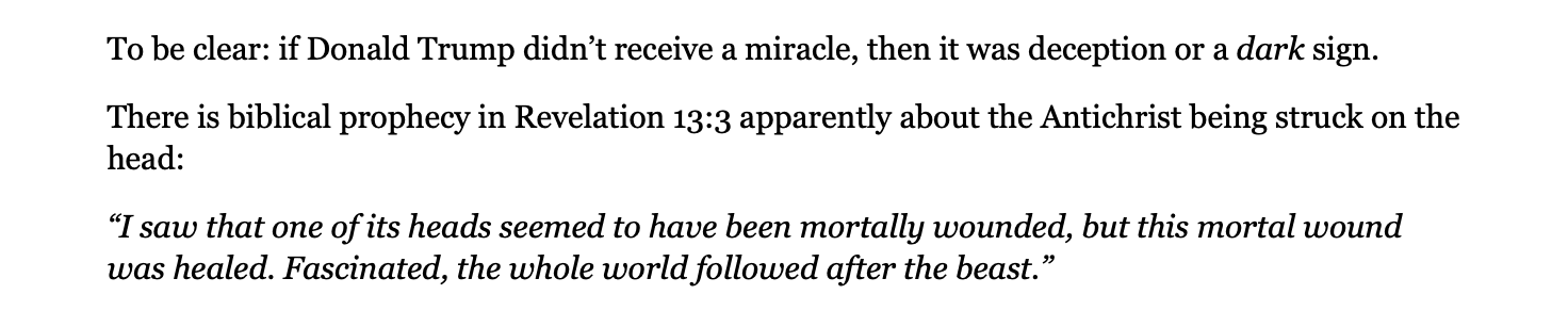 Nello stesso documento Alexander ha aggiunto anche un riferimento alla Bibbia, affermando che «Nel libro dell’Apocalisse 13:3 c’è una profezia biblica che sembra parlare dell’Anticristo colpito alla testa», interpretando questo passaggio come una possibile conferma simbolica del legame tra Trump, l’attentato di Butler e la sua presunta identificazione con la figura di opposizione a Cristo.