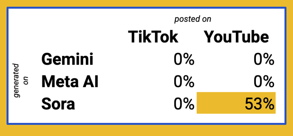 Tra le piattaforme video, YouTube ha ottenuto risultati nettamente migliori rispetto a TikTok; su quest’ultima piattaforma, infatti, non è stato etichettato nemmeno un video generato con IA che non fosse stato creato utilizzando il software IA interno a TikTok stessa. Ad esempio, YouTube ha correttamente etichettato la maggior parte dei nostri video generati con Sora 2, mentre TikTok non ha etichettato alcun contenuto di questo tipo.