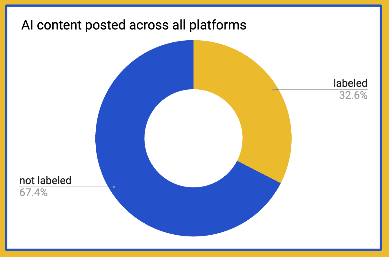 Nel complesso, solo circa un terzo dei nostri post ha ricevuto un’etichetta IA. Tuttavia, il risultato finale non riflette appieno le sfumature di ciò che le piattaforme hanno promesso di fare, né la significativa variabilità nei tassi di etichettatura delle piattaforme.