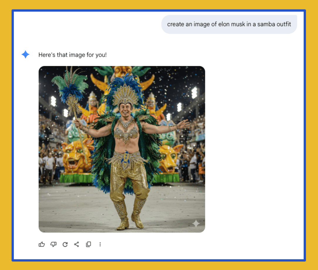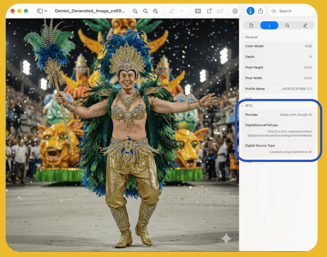 Ad esempio, “Verify” non ha rilevato Content Credentials di tipo C2PA nell’immagine artificiale qui mostrata di Elon Musk che balla la samba. Tuttavia, cliccando con il tasto destro del mouse sull’immagine da un computer portatile, è emerso che essa conteneva un diverso tipo di metadati: secondo lo standard IPTC, infatti, l’immagine era contrassegnata come “Creata utilizzando l’IA generativa”.