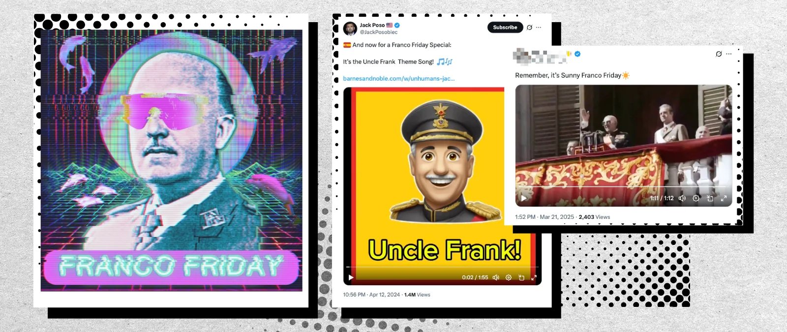 At the same time, there is also space for Franco Fridays, an expression whose origin is unknown (the first publications we have found on X date from 2021). Jack Posobiec, conservative activist who has already spread conspiracy theories such as Pizzagate (an alleged pedophile ring in the basement of a Washington DC pizzeria involving Hillary Clinton and part of her campaign team), also actively promotes Franco Fridays on X. The first mention of this term on his official account is from December 29, 2023. Since then, he has posted dozens of tweets referring to Franco Fridays, all with thousands of views. He has even shared an AI-generated song called Uncle Frank, in which he says phrases such as “Spain was in trouble long long ago, but then came a man called Uncle Frank. He was brave and he was bold“ or ”Uncle Frank gave the reds a spank”.