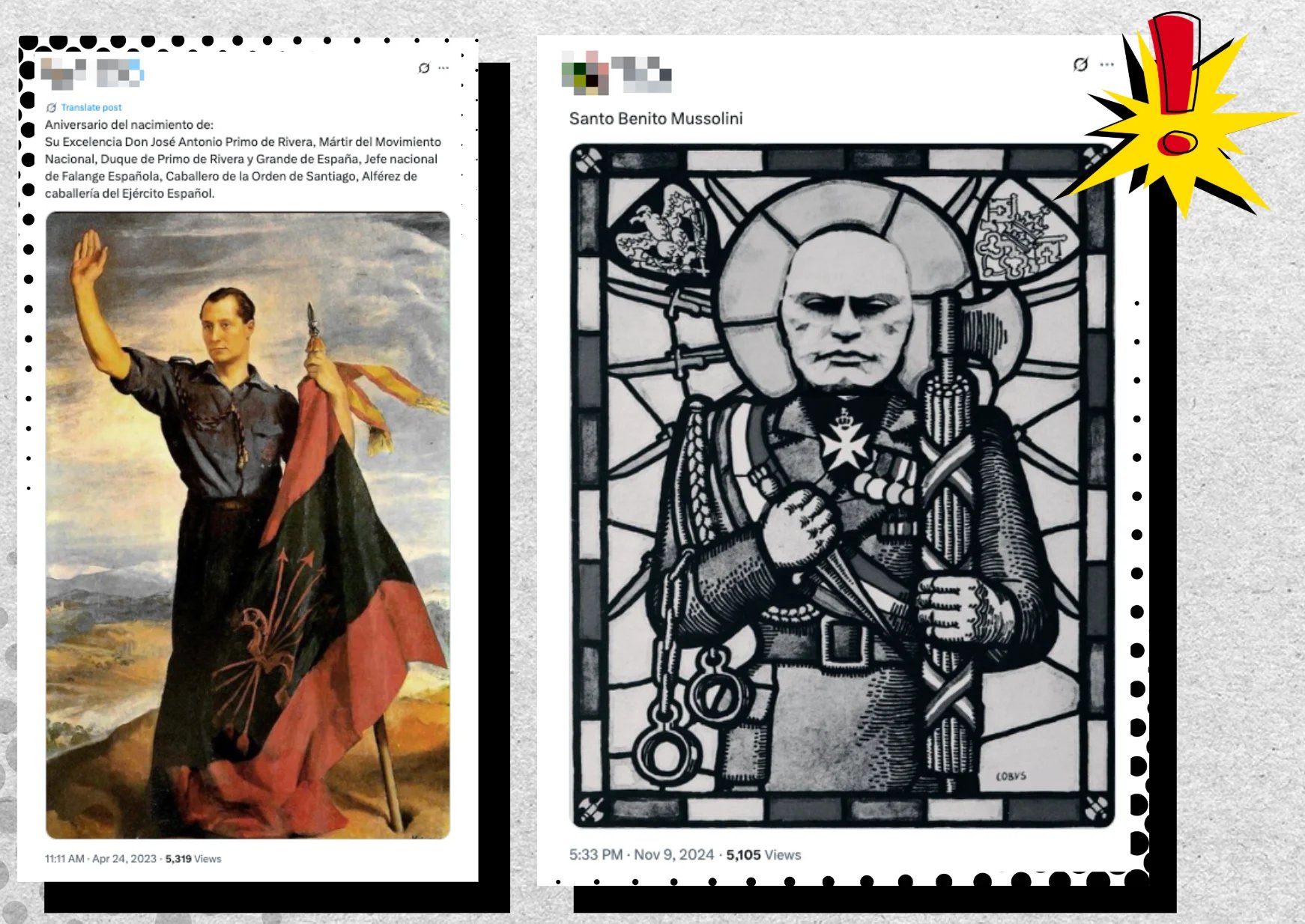 Content that uses these resources contains symbols related to Franco’s regime, such as the Valley of the Fallen (called Cuelgamuros Valley since 2022, due to the implementation of the Democratic Memory Law), a symbol of Franco’s legacy and the place where Primo de Rivera and Francisco Franco were buried until their exhumations in April 2023 and October 2019, respectively, or the Spanish flag used during Franco’s dictatorship with the eagle of St. John the Evangelist.
