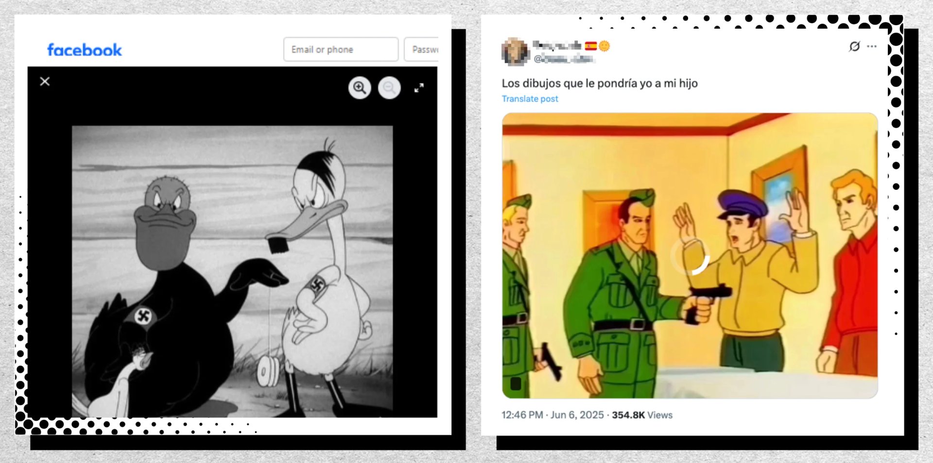 There are other examples of cartoons that were originally used as propaganda against the Nazi or fascist movement but are now being shared in fragments on social media with messages of support for these movements. This has also happened with The Ducktators (1942), a Warner Bros production released as part of a series of propaganda shorts broadcast during World War II, featuring a duck with a mustache (which is actually a caricature of Adolf Hitler), another bald duck with an Italian accent (representing Benito Mussolini), and a duck with glasses and a squeaky voice (a parody of Hideki Tōjō, a Japanese military officer who served as prime minister during World War II). The three form a dictatorship on the farm, where they simulate military marches, give fascist salutes, and deliver speeches. Images of these moments circulate on platforms such as X, Facebook, and TikTok.